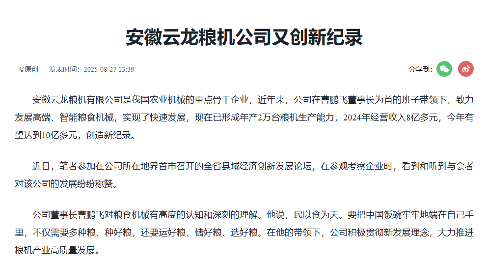 • 2025-08-29 中國工業(yè)新聞網(wǎng):安徽云龍糧機公司又創(chuàng)新紀(jì)錄